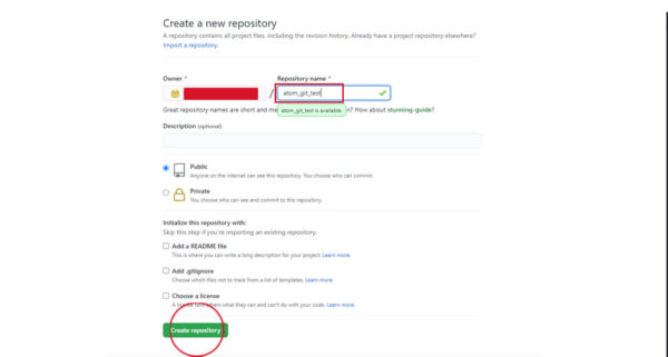 「Create a new Repository」のページが開くので「Repository name」の欄に新しいRepositoryにつける任意の名前を(ここではatom_git_testにしました)入力し、下部の「create Repository」をクリックすればRepository作成完了です。