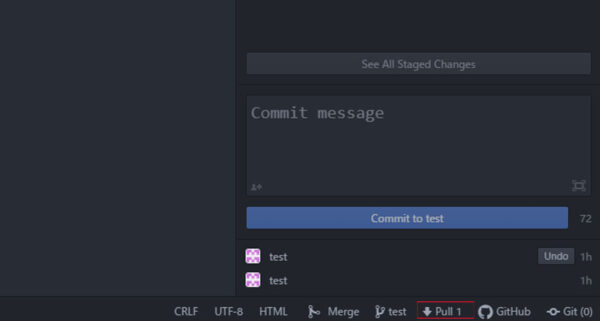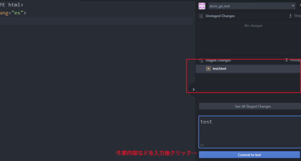 すると変更のあったファイルがStaged Changesの欄に降りてくるので、