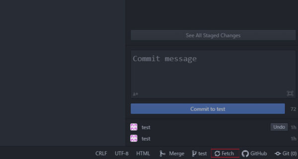 ATOMのGitタブの最下部にある「Fetch」をクリックして、ファイルの更新があったかを確認します。