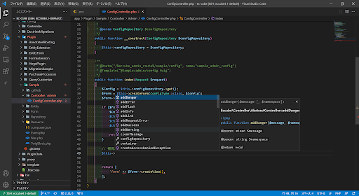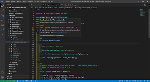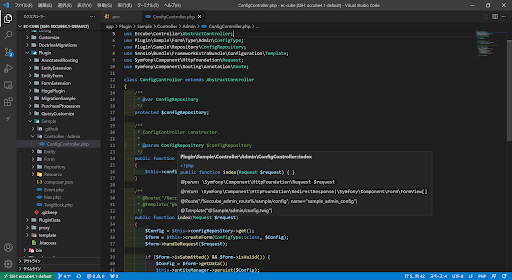 試しに app/Plugin/Sample/Controller/Admin/ConfigController.php を開いて、indexアクションにカーソルをのせてみます。 すると、きちんとPHPDocに書かれている内容が表示されます。