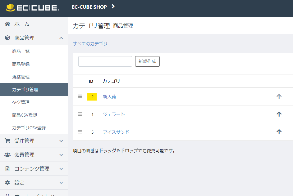管理画面にログインし、商品管理->カテゴリ管理を選択してください。 新入荷のカテゴリIDは「2」であることを確認します。 ※今回は、新入荷のカテゴリIDの「2」を利用しますが、「2」以外が設定されている場合や他のカテゴリの商品を表示させる場合は、該当のカテゴリIDをご利用ください。